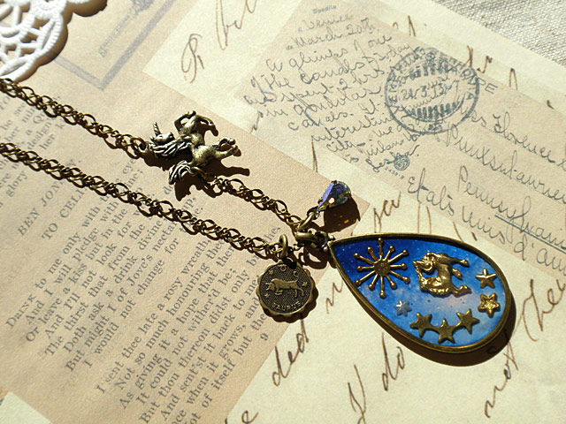 青地とブラスゴールドで小さな小さな宇宙をイメージしました。コネクターのユニコーンがポイントです。