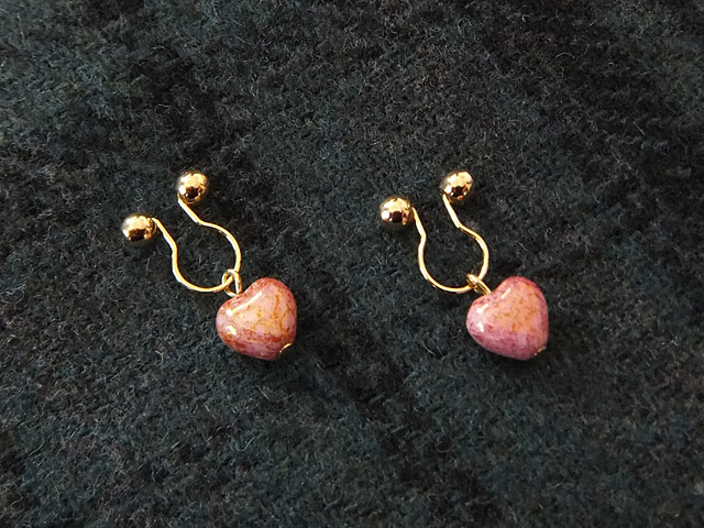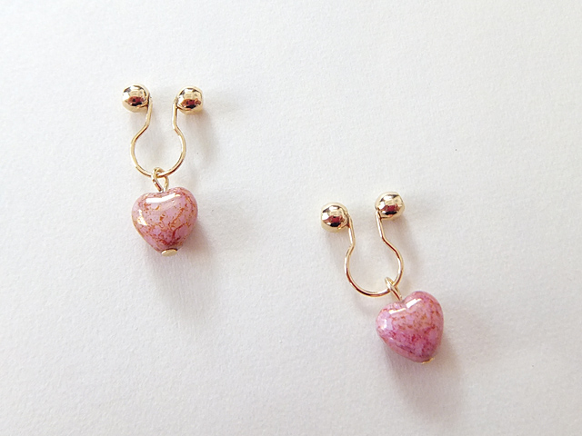ぷっくりとしたハートが、動くたびに揺れます。 ハートの色はピンクベースで、赤いマーブルが混ざっています。