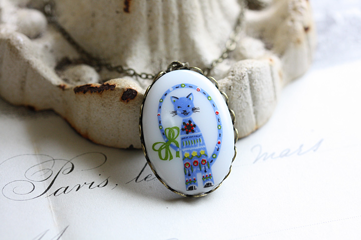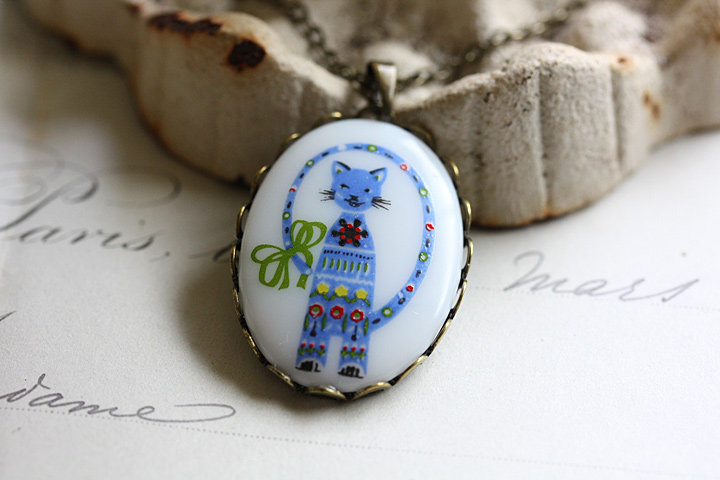 童話の挿絵に出てくるようなかわいらしい表情のネコが描かれたカボション。