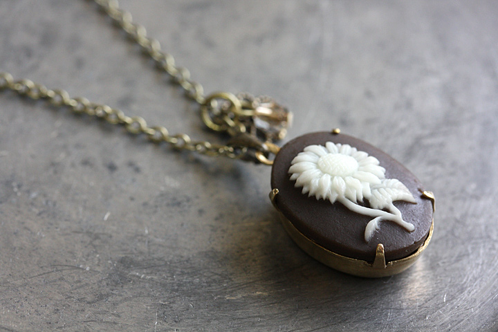 ブラウンカラーにホワイトでひまわりが浮き彫りにされた、アクリル製のヴィンテージカボション。
