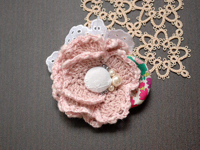 綿、レース、くるみボタン、パールビーズ、クリップ付きコサージュピン |