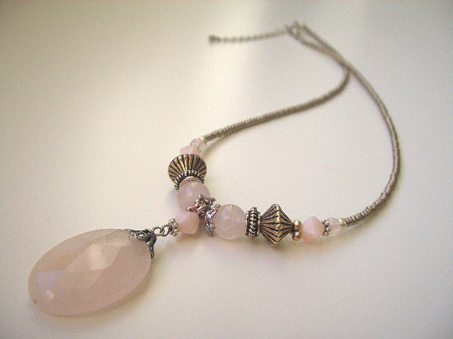 天然石 (ローズクォーツ/約2.5cm×1.8cmオーバル型、8mm・4mm丸玉)、チェコビーズ、ガラス製シードビーズ、ピュータービーズ、メタル風樹脂ビーズなど |