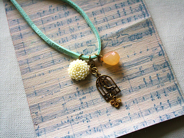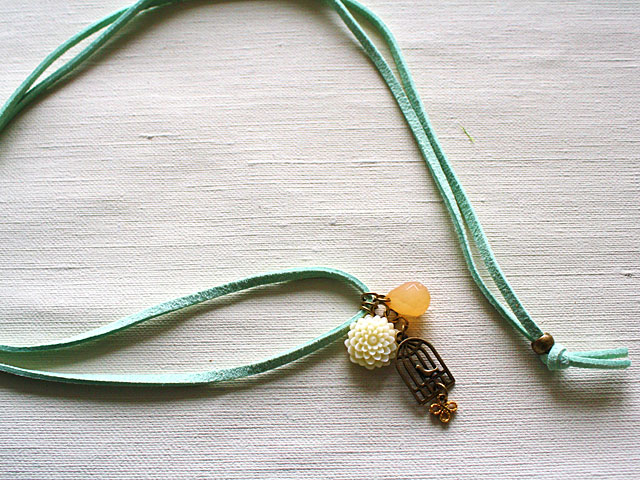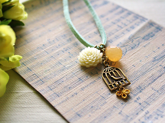 ひものパステルグリーンとアンティーク調の鳥かごが、スイートな印象のネックレスです。