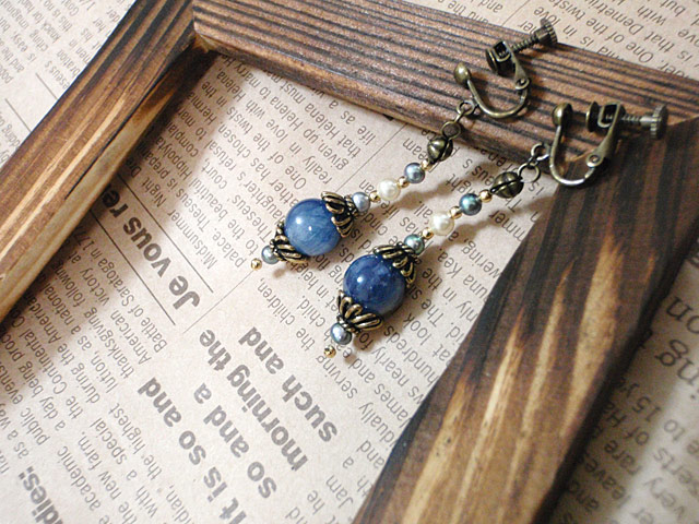 カイヤナイト (10 mm)、淡水パール (メタリックネイビー4mm)、樹脂パール (クリーム4mm)、メタルビーズ・テグス・真鍮金具等 |