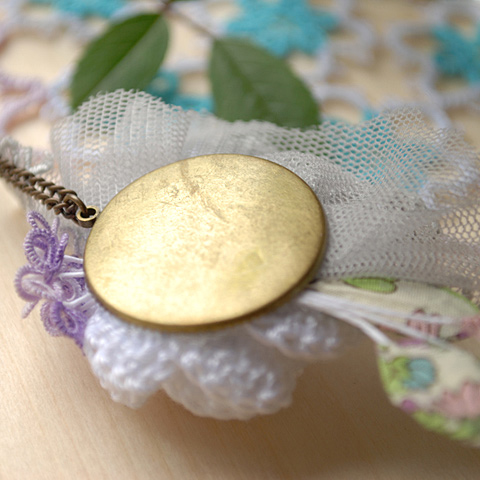 綿、レース、スワロフスキー、ミール皿 (真鍮)、チェーン (真鍮) |