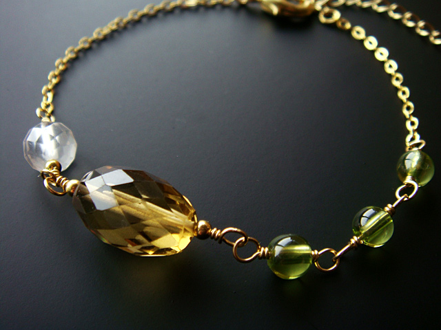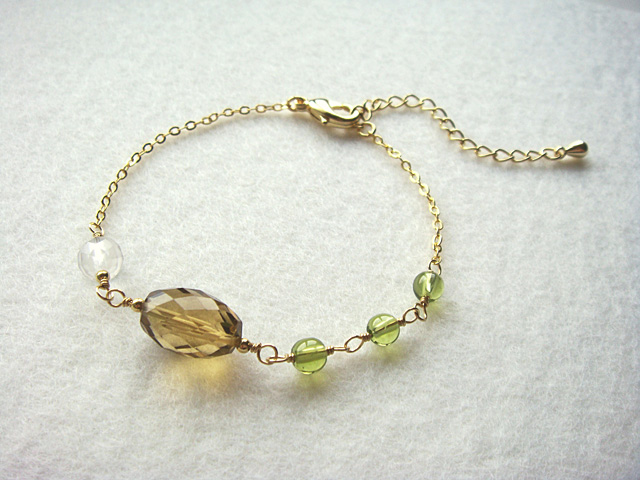 ビールのような落ち着いたブラウンカラーが美しい大粒のビアクォーツに、半透明のミルキークォーツと小粒のペリドットを合わせてみました。