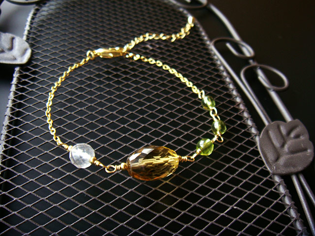 天然石 (ビアクォーツ、ミルキークォーツ、ペリドット)、メタルビーズ、金具 (ゴールドカラー) |