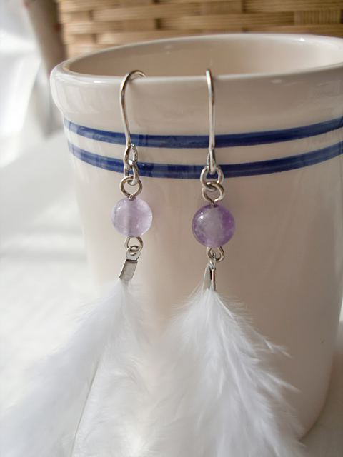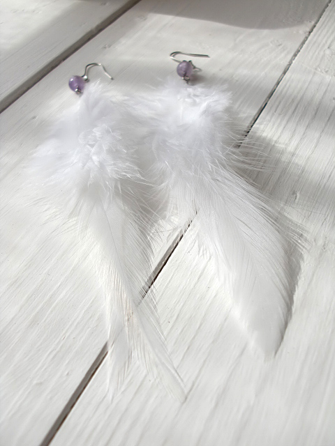 天然の羽根と、天然石のケープアメジストを合わせてたピアスです。