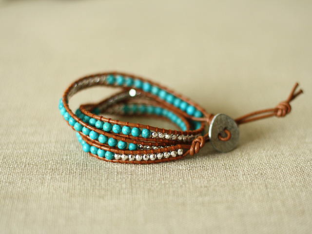 牛革 (表革:ブラウン)、天然石ターコイズ、プラスチックビーズ、金属パーツ |