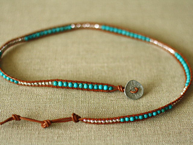 革のコードにシルバーのビーズとターコイズを編みこんだ、コードブレスレットです。