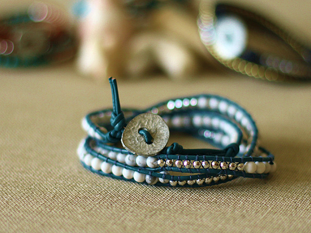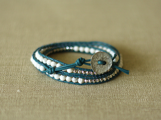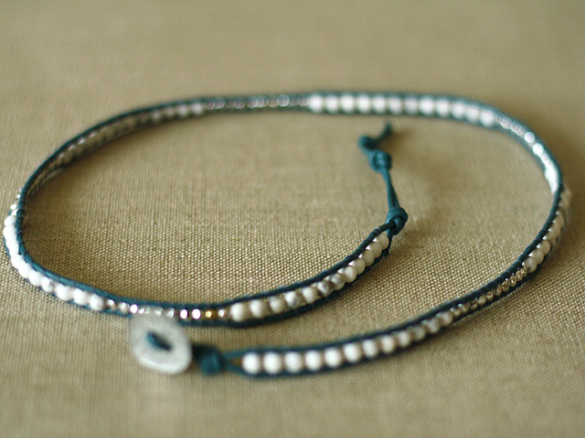 革のコードにシルバーのビーズとハウライトを編みこんだ、コードブレスレットです。