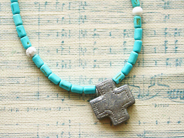 天然石ターコイズのネックレスにクロスモチーフを付けました。