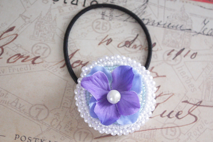 綺麗な色のあじさいを中央におき、周りをホワイト系のビーズで刺繍した大人可愛いヘアゴムです。