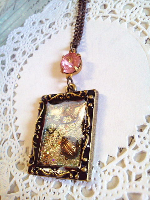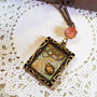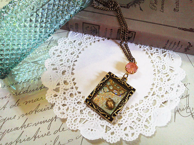 絵画の額縁のような台の中に、 てんとう虫を閉じ込めました。 ワンポイントに、 ピンクのアンティーククリスタルチャームを。 透明感のある 落ち着いた雰囲気に仕上げられています。