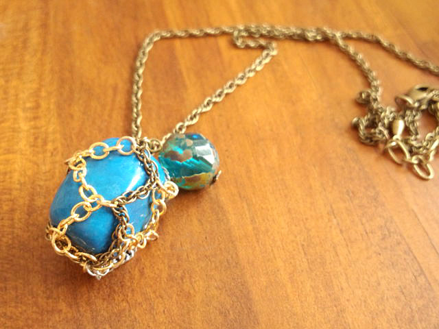 いろんな色のチェーンで包み込んだターコイズと、地球に見えるチェコビーズを使っています。