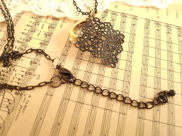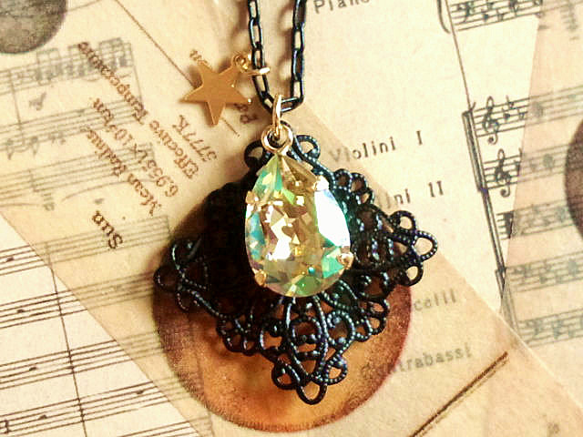 大きめなルミナスグリーンのスワロフスキーに、繊細なデザインの黒い透かしパーツを組み合わせて、ちょっと大人な雰囲気に仕立てました。