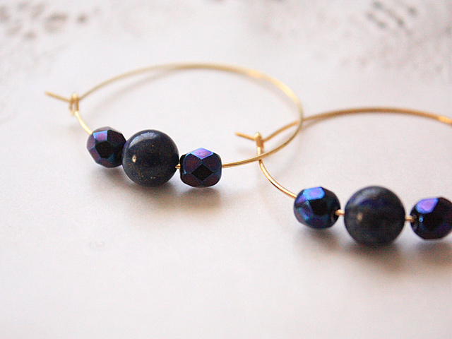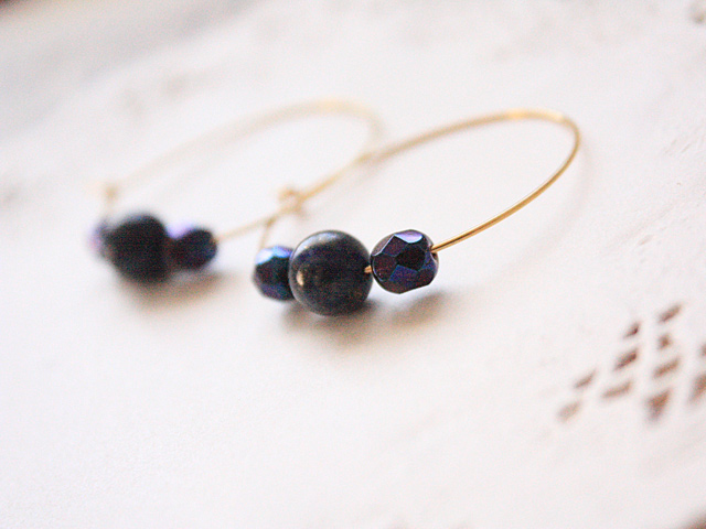 「幸運の石」とよばれるラピスラズリと、光の具合によって青・紫・茶に見えるチェコガラスビーズと合わせたフープピアスです。