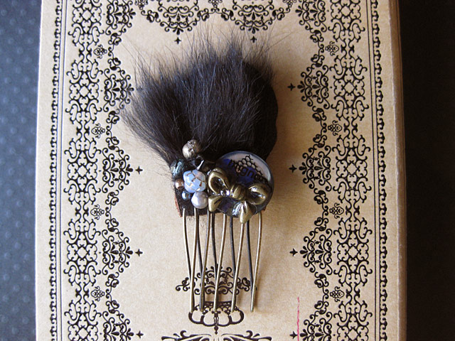 本皮に毛皮を重ね、押し花 (ロベリア)やビーズ、金属パーツをレジンで閉じ込めたボタンをワンポイントにアレンジしました。