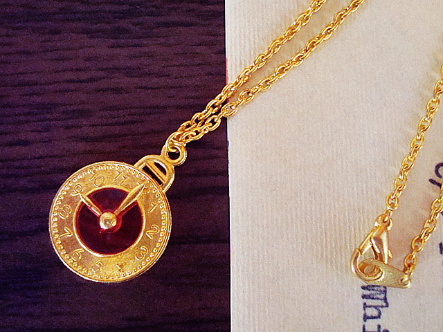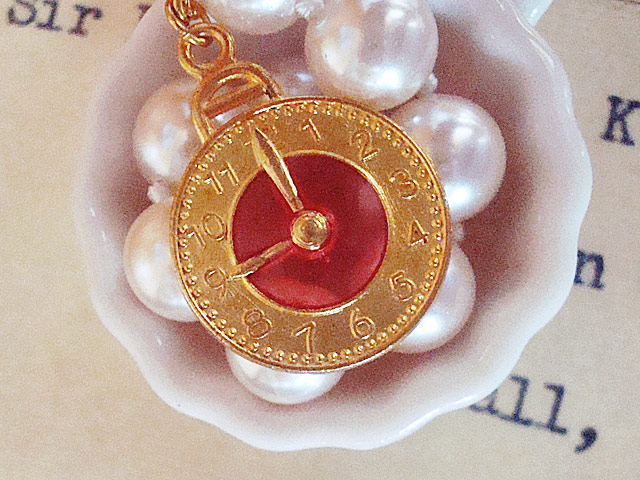 物語に出てくる時計に赤色のレジンを流し込み、カワイイネックレスに仕上げました。
