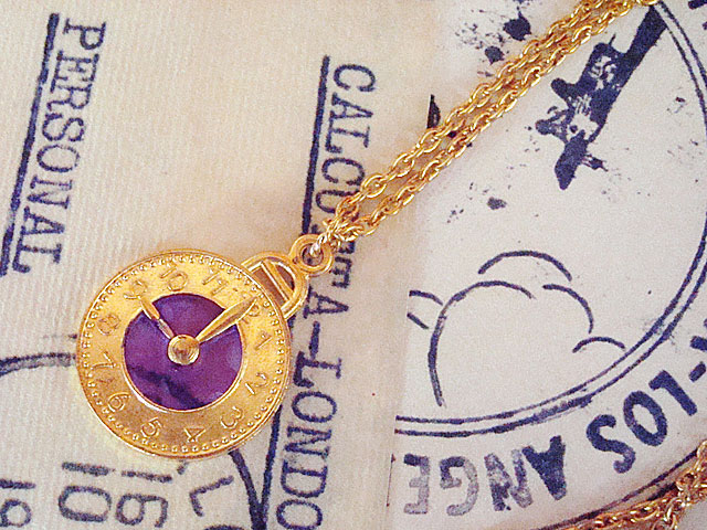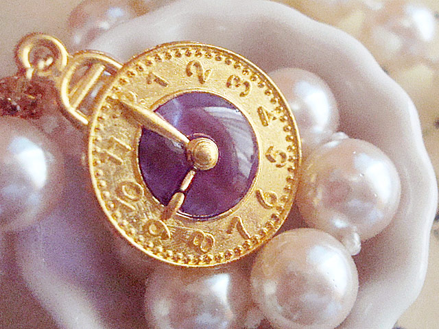 物語に出てくる時計に紫色のレジンを流し込み、カワイイネックレスに仕上げました。